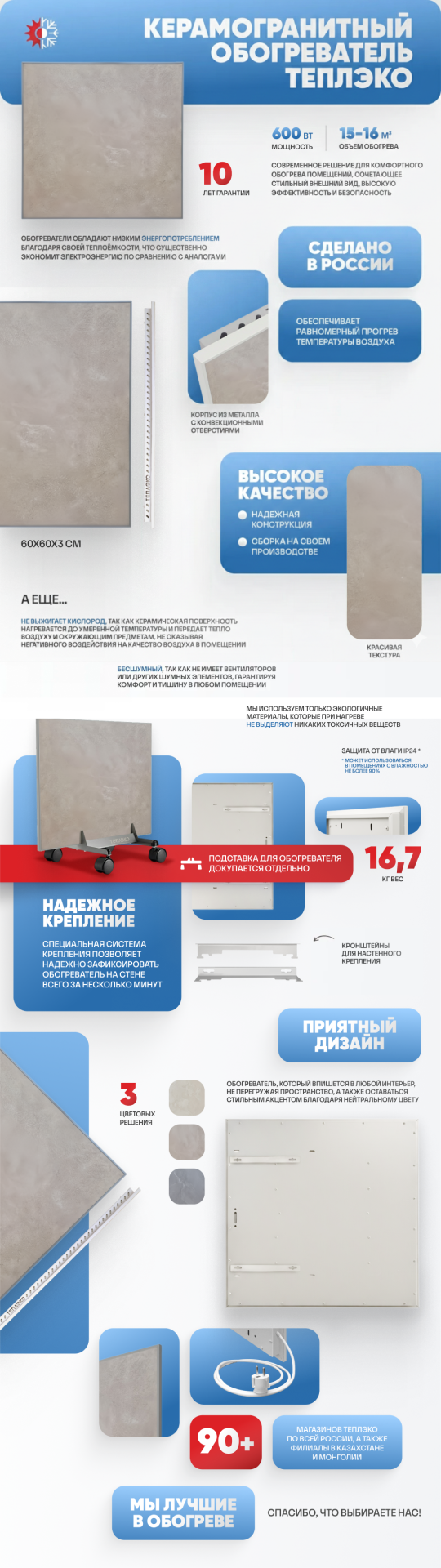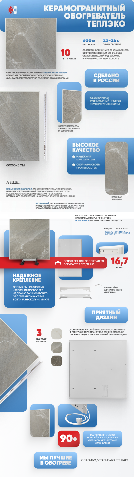 Габариты устройства составляют 602x302x30 мм, а вес с упаковкой — около 7 кг. В комплект входят два прочных кронштейна и паспорт изделия с рекомендациями по установке и эксплуатации. Мы производим обогреватели в России, основываясь на собственных технологических разработках и строгом контроле качества на каждом этапе производства. Выбирая наш керамогранитный обогреватель, вы получаете не только источник тепла, но и надежный и эстетичный элемент вашего дома. В ТеплЭко мы стремимся сделать вашу жизнь теплой, безопасной и комфортной каждый день.